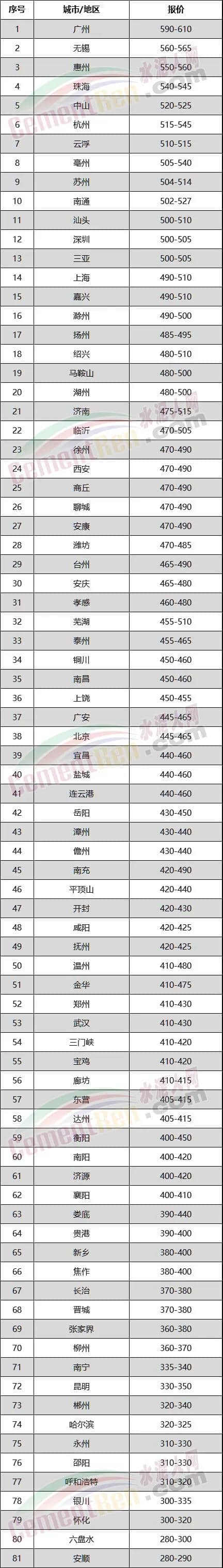 從水泥人網(wǎng)信息中心重點(diǎn)監(jiān)管區(qū)域數(shù)據(jù)來看,廣州區(qū)域C30混凝土報價590-610元/方,突破600元/方大關(guān),除廣東省大部分區(qū)域外,江蘇、浙江、安徽、海南、上海、山東省部分區(qū)域過500元/方。