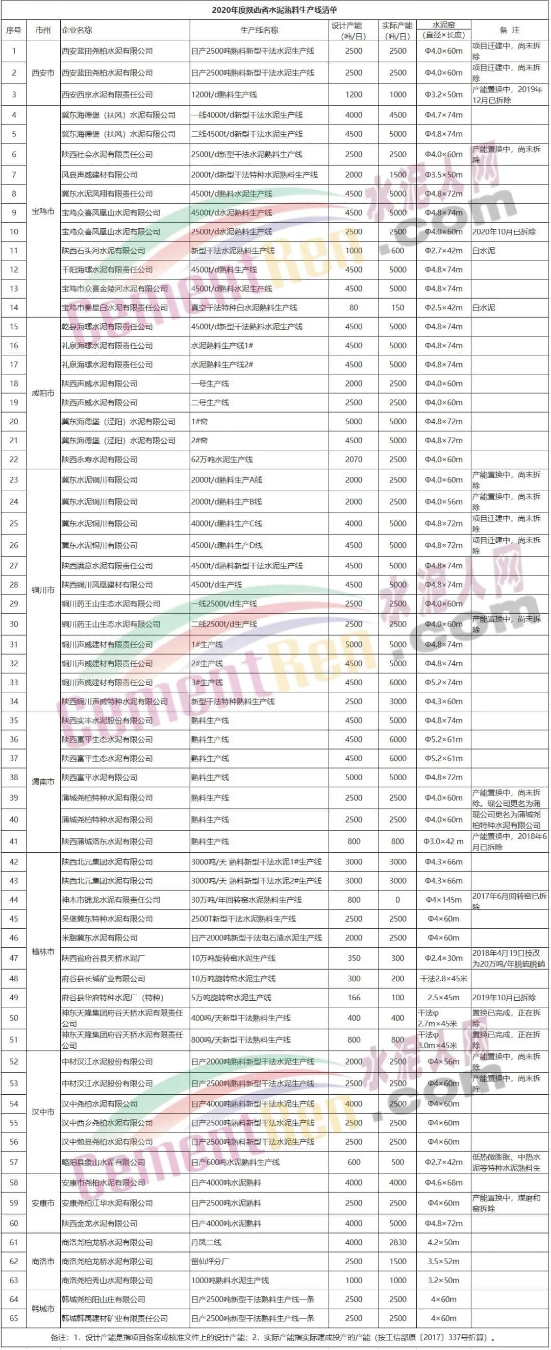 4月1日,陜西省工信廳發布《2020年度陜西省水泥熟料、平板玻璃、生產線清單》,公示清單中包括66個水泥熟料項目,年產能合計共5990萬噸/年,其中5條熟料生產線已拆除,2條熟料生產線正在拆除,11條熟料生產線正在拆除。