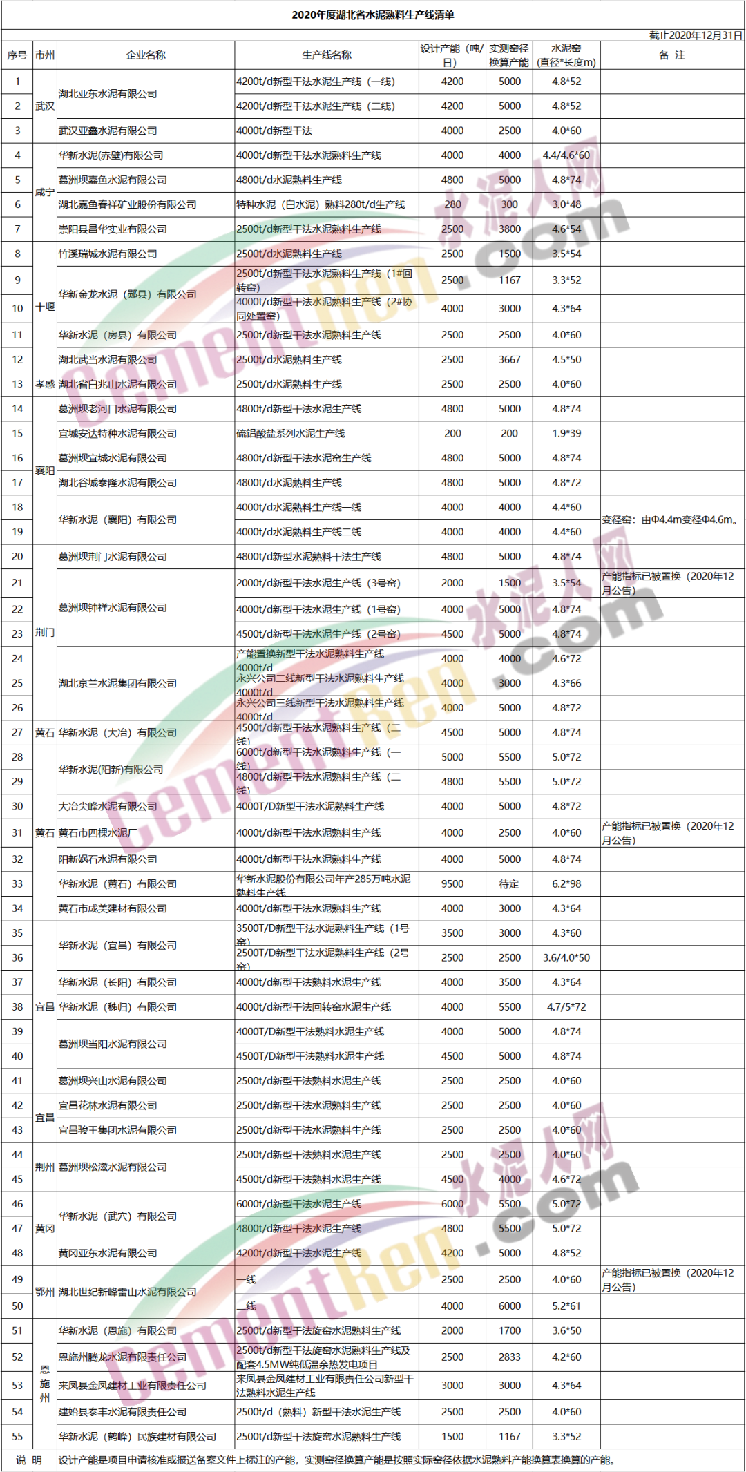 3月31日湖北省經濟和信息化廳發布《關于2020年度全省水泥熟料平板玻璃生產線清單的公告》,公告中包括55個水泥公司,按窯徑計算總計共5920萬噸/年熟料產能,其中包括兩條2500t/d生產線和一兩條1500t/d熟料生產線已置換。