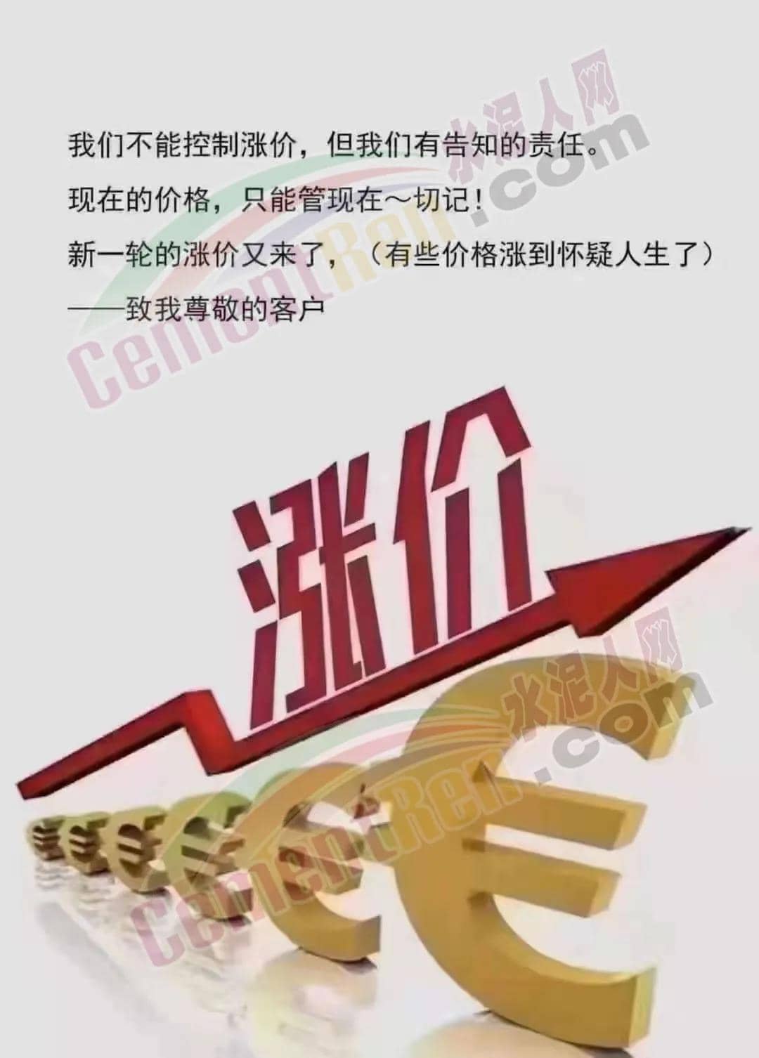 有水泥經(jīng)銷商發(fā)致客戶稱:“我們不能控制漲價,但我們有告知的責任?,F(xiàn)在的價格,只能管現(xiàn)在~切記!新一輪漲價又來了,有些價格漲到開始懷疑人生了!”