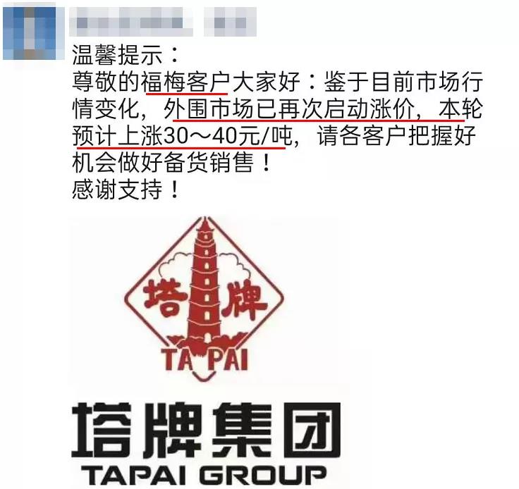 塔牌水泥經(jīng)銷商通知,鑒于目前市場行情變化 ,外圍市場已經(jīng)再次啟動漲價,本輪預(yù)計上漲30~40元/噸。