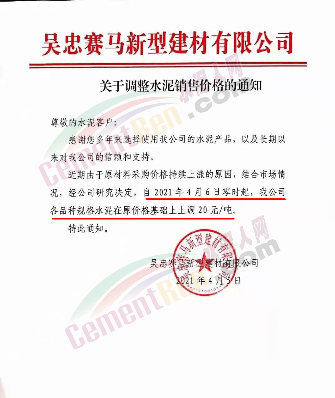 寧夏吳忠賽馬新型建材有限公司通知,由于原材料采購價格持續(xù)上漲的原因,結(jié)合市場情況,經(jīng)公司研究決定 ,自4月6日零時起,公司各品種規(guī)格水泥在原價基礎(chǔ)上上調(diào)20元/噸。