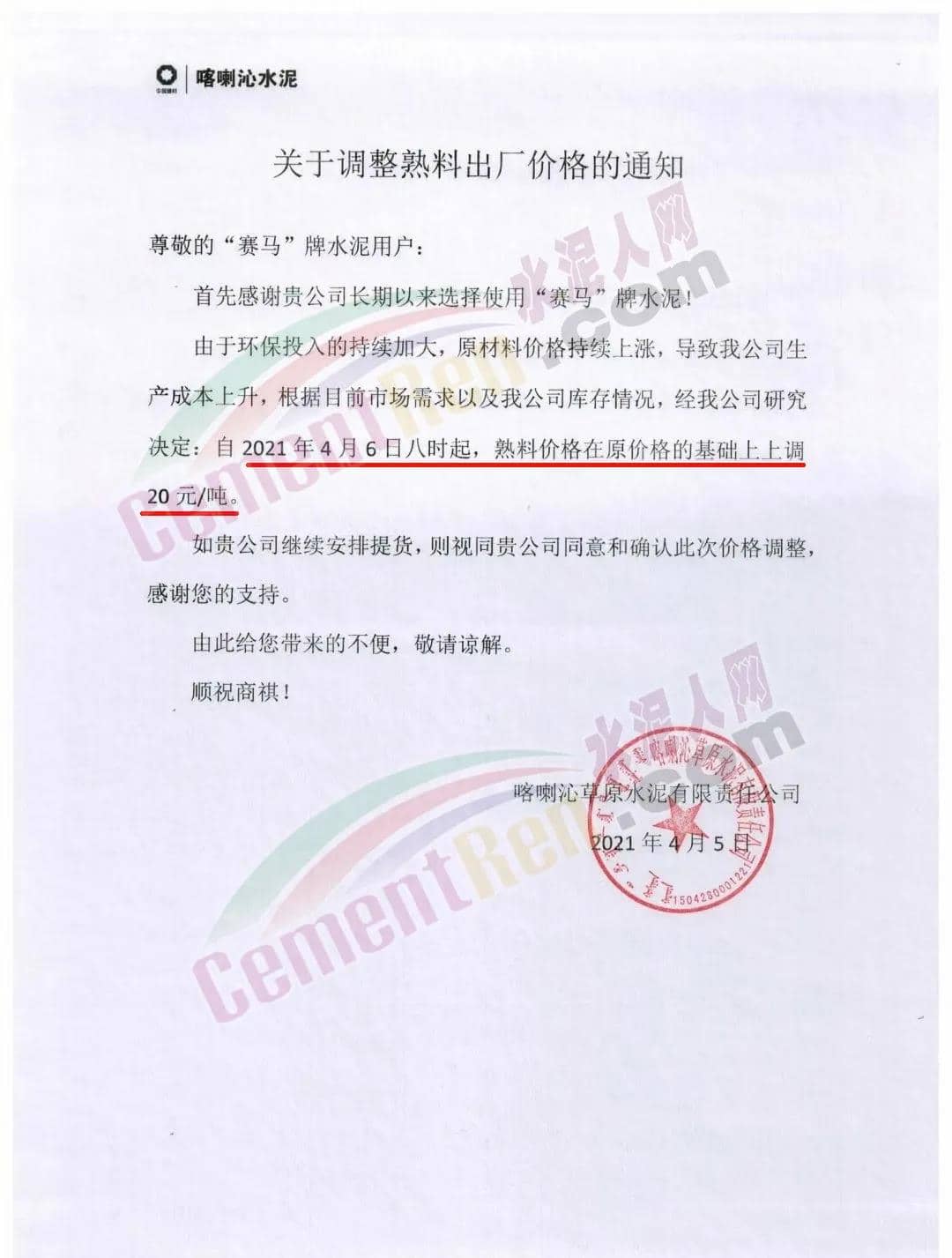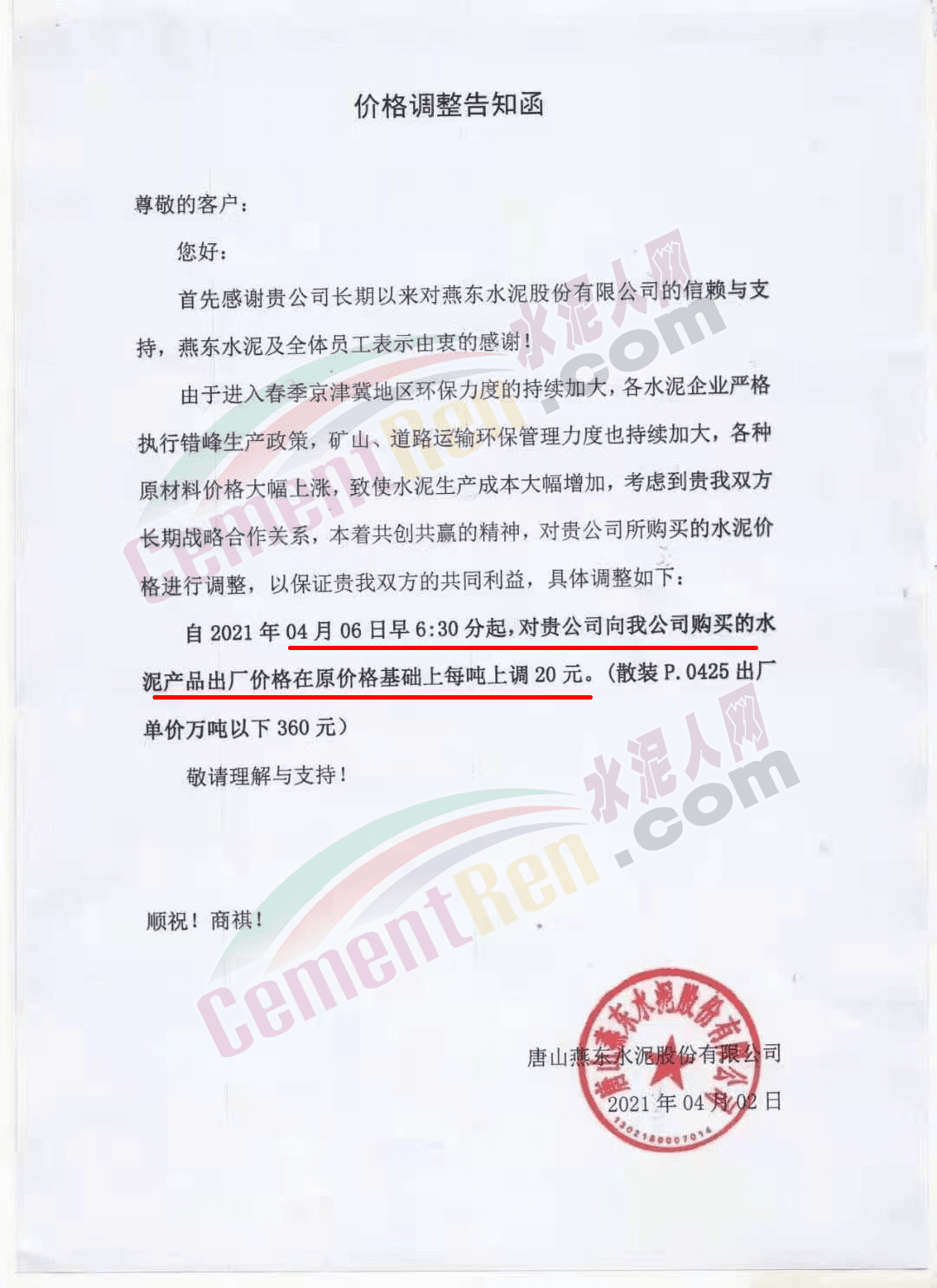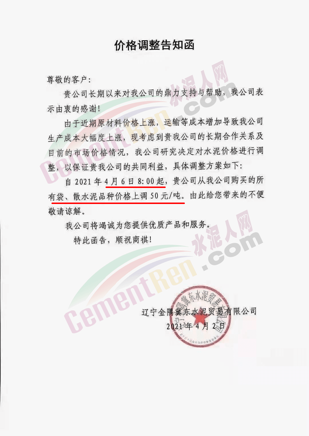 尊敬的客戶:根據(jù)目前市場行情,經(jīng)公司研究決定,自2021年4月8日零時起我司發(fā)往各區(qū)域的各品種各型號水泥出廠單價上調(diào)40元/噸 。