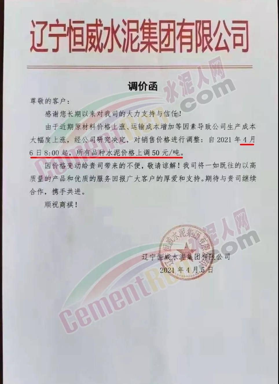 遼寧恒威水泥集團通知,由于近期原材料價格上漲,運輸成本增加等因素導(dǎo)致公司生產(chǎn)成本大幅度上漲,經(jīng)公司研究決定,對銷售價格進行調(diào)整,自4月6日8時起,所有品種水泥價格上調(diào)50元/噸。