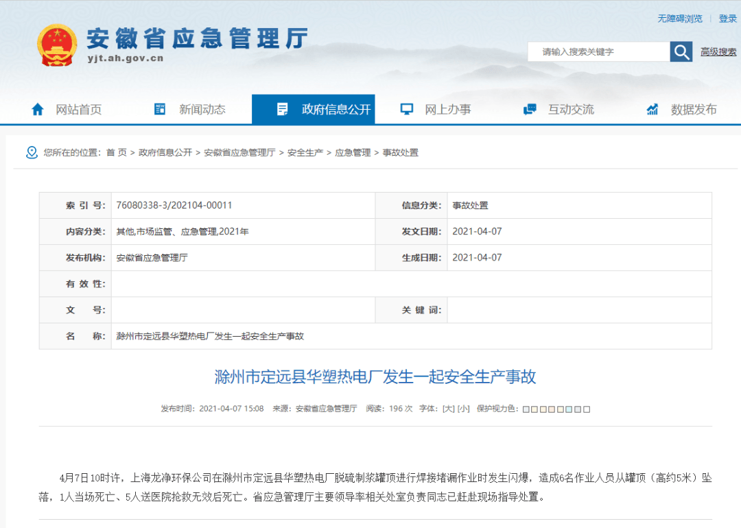 據安徽省應急管理廳官網通報,4月7日10時許,上海龍凈環保公司在滁州市定遠縣華塑熱電廠脫硫制漿罐頂進行焊接堵漏作業時發生閃爆,造成6名作業人員從罐頂(高約5米)墜落,1人當場死亡、5人送醫院搶救無效后死亡。省應急管理廳主要領導率相關處室負責同志已趕赴現場指導處置。