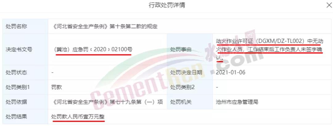 處罰決定書文號:(冀滄)應急罰﹝2020﹞02100號