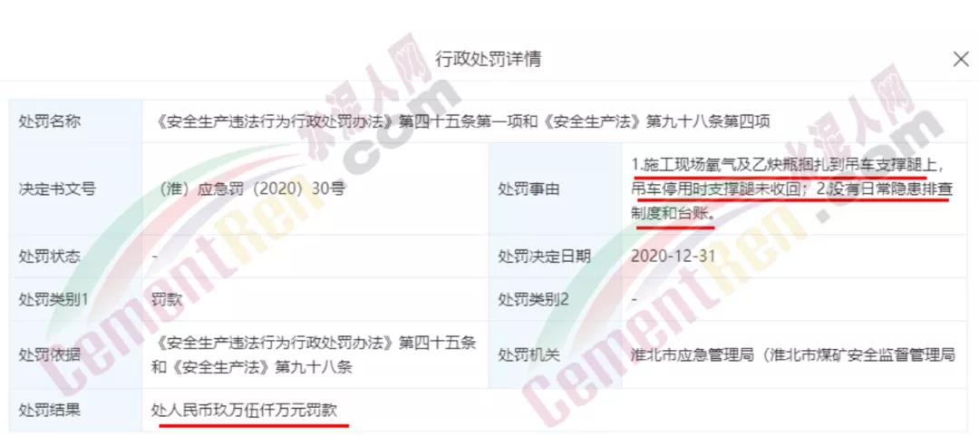 處罰日期:2020年12月31日;處罰結果:處人民幣玖萬伍仟萬元罰款;處罰事由:1.施工現場氧氣及乙炔瓶捆扎到吊車支撐腿上,吊車停用時支撐腿未收回;2.沒有日常隱患排查制度和臺賬。