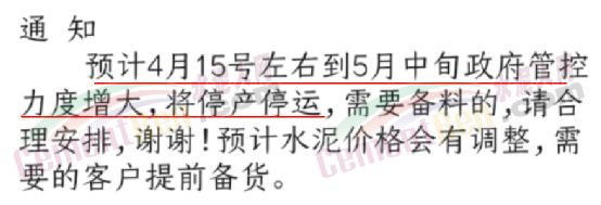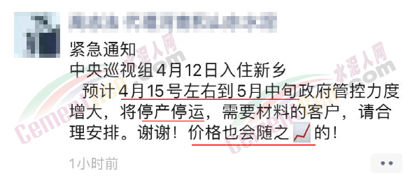 日前,有水泥經(jīng)銷商在社交平臺發(fā)布“緊急通知”稱,預計4月15日到5月中旬新鄉(xiāng)區(qū)域?qū)⑼.a(chǎn)停運,材料價格也會隨之上漲。