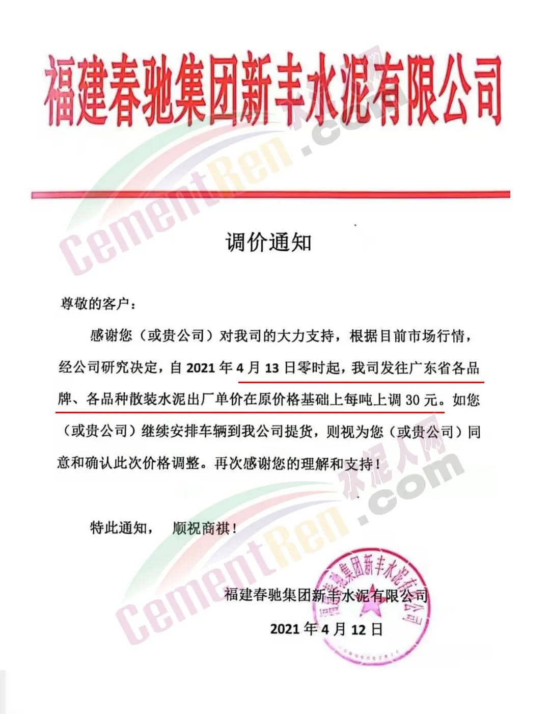 福建春馳集團新豐水泥有限公司通知自4月13日零時起,發(fā)往廣東省各品牌、各品種散裝水泥出廠單價在原價格基礎上上調(diào)30元/噸。