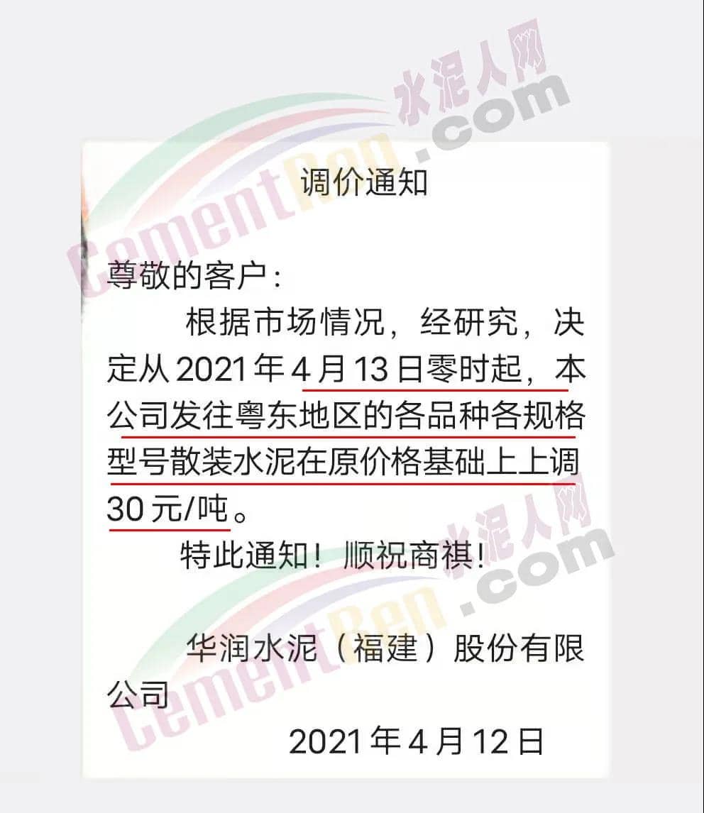 華潤水泥(福建)股份有限公司通知從4月13日零時起,公司發(fā)往粵東地區(qū)的各品種各規(guī)格型號散裝水泥在原價格基礎上上調(diào)30元/噸。