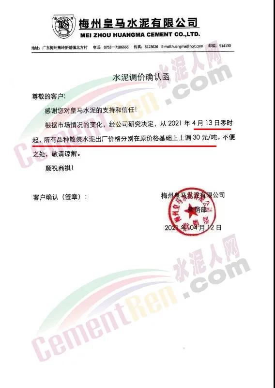 梅州皇馬水泥有限公司從4月13日零時起,所有品種散裝水泥出廠價格分別在原價格基礎上上調(diào)30元/噸。