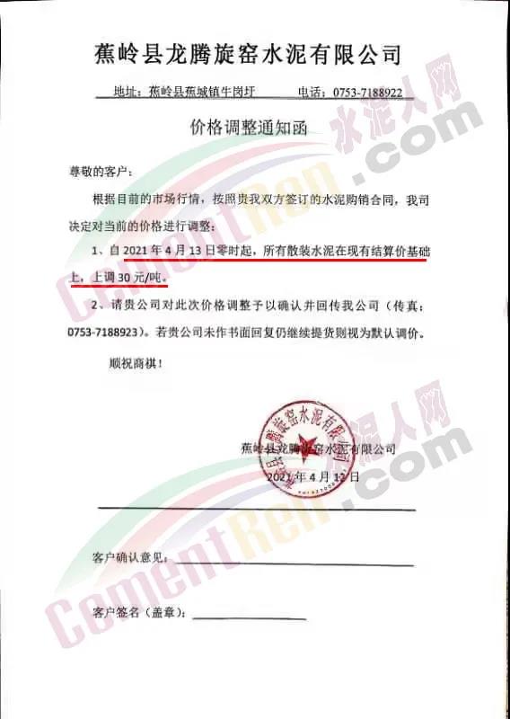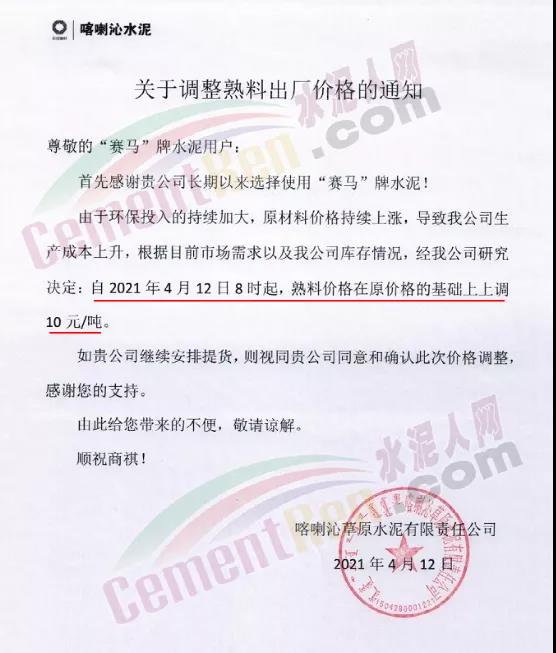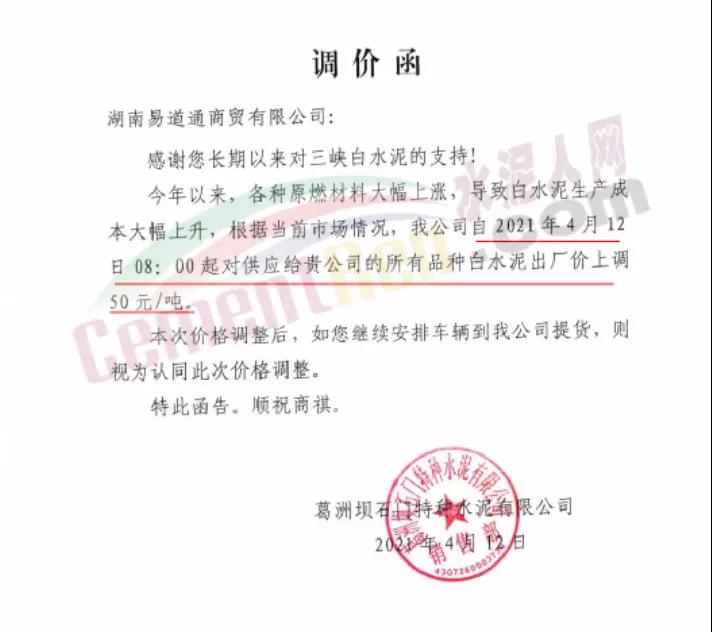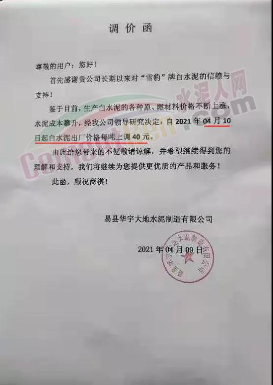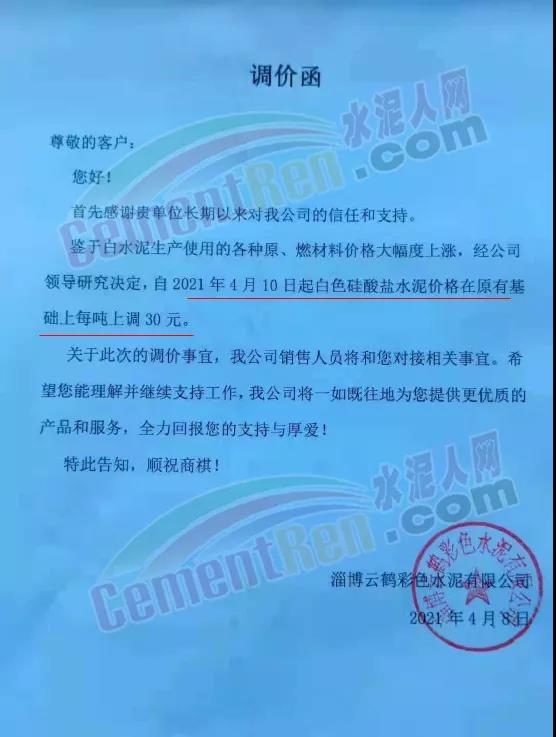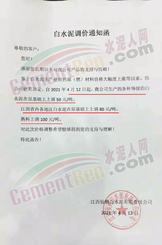 江西仙鶴白水泥有限責任公司通知鑒于白水泥生產(chǎn)使用的原(燃)材料價格大幅度上漲等因素。經(jīng)公司研究決定,自4月12日起,公司生產(chǎn)的各種等級的白水泥在原基礎上上調(diào)50元/噸。江西省內(nèi)各地區(qū)白水泥在原基礎上上調(diào) 80元/噸,熟料上調(diào)100元/噸。