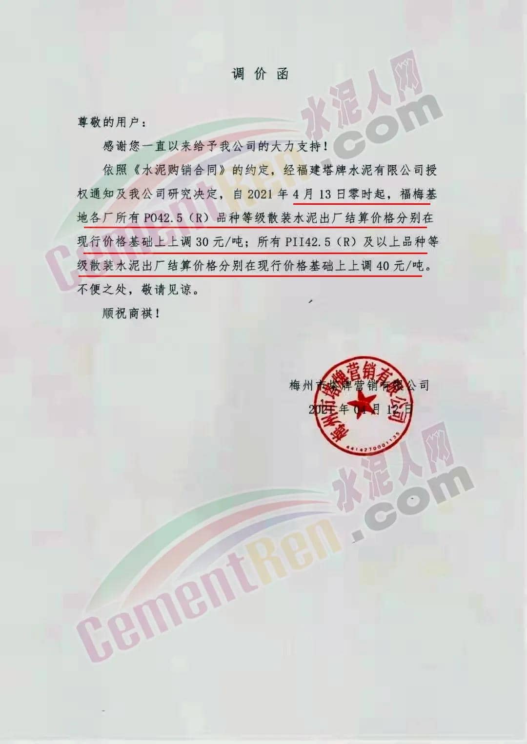 梅州市塔牌營銷有限公司通知,經(jīng)福建塔牌水泥有限公司授權通知及公司研究決定,自4月13日零時起,福梅基地各廠所有PO42.5(R)品種等級散裝水泥出廠結(jié)算價格分別在現(xiàn)行價格基礎上上調(diào)30元/噸;所有 PII42.5(R)及以上品種等級散裝水泥出廠結(jié)算價格分別在現(xiàn)行價格基礎上上調(diào)40元/噸。