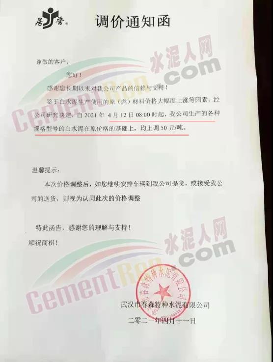 武漢市春森特種水泥有限公司通知,鑒于白水泥生產(chǎn)使用的原(燃)材料價格大幅度上漲等因素。經(jīng)公司研究決定,自4月12日8時起,公司生產(chǎn)的各種規(guī)格型號的白水泥在原價格的基礎上,均上調(diào)50元/噸。