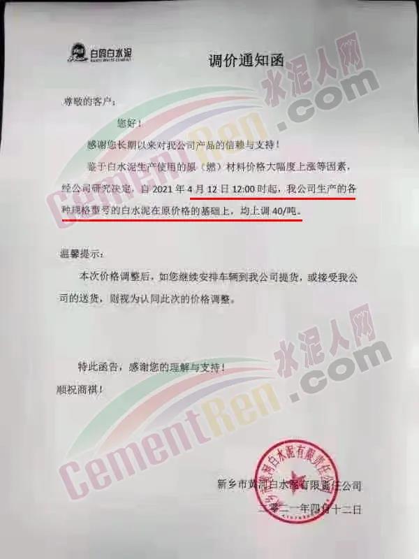 新鄉(xiāng)市黃河白水泥有限責任公司通知,鑒于白水泥生產(chǎn)使用的原(燃)材料價格大幅度上漲等因素,經(jīng)公司研究決定,自4月12日12時起,公司生產(chǎn)的各種規(guī)格型號時白水泥在原價格的基礎上,均上調(diào)40元/噸。
