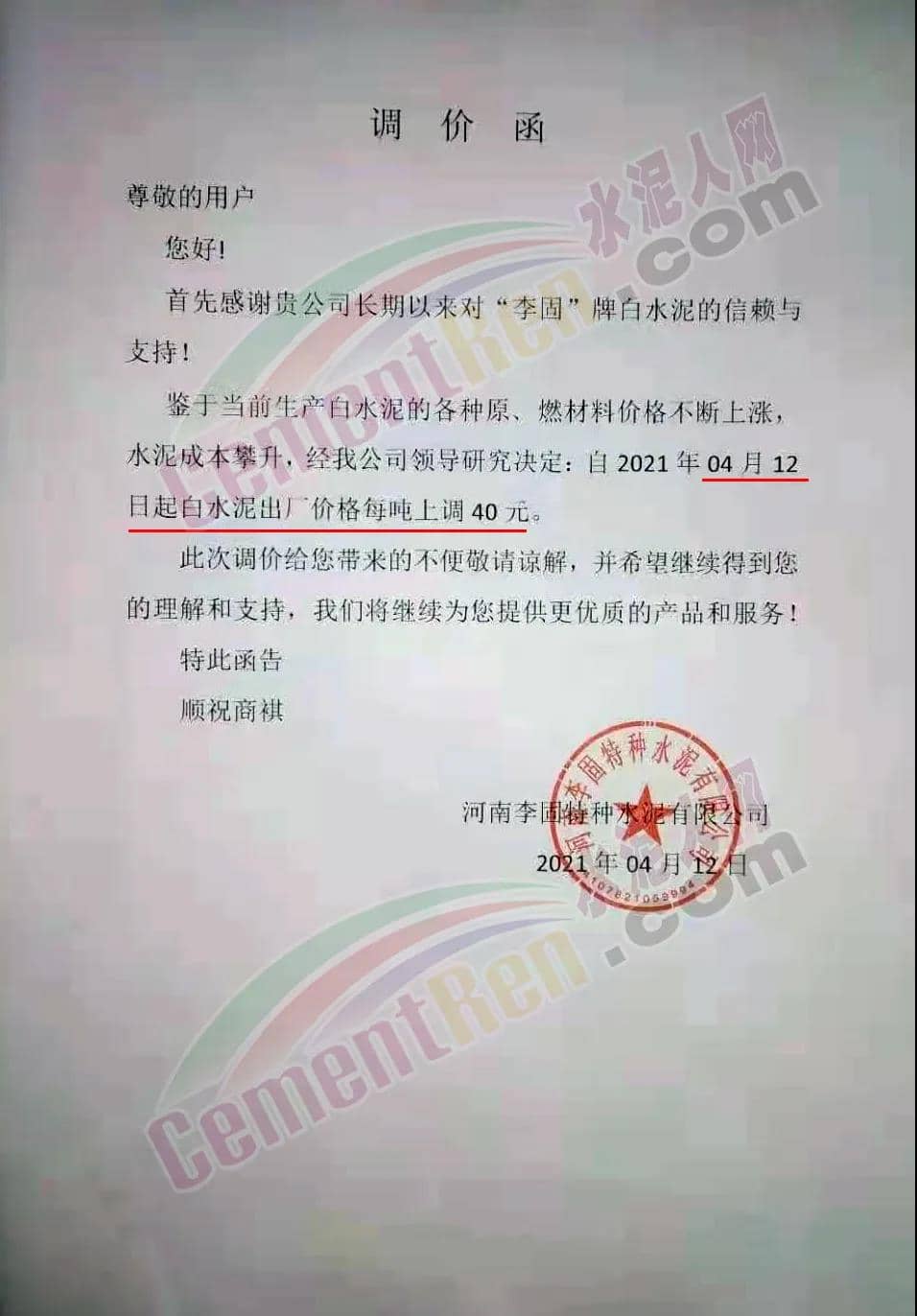 河南李固特種水泥有限公司通知,鑒于當前生產(chǎn)白水泥的各種原、燃材料價格不斷上漲,水泥成本攀升,經(jīng)公司領導研究決定,自2021年4月12日起白水泥出廠價格上調(diào)40元/噸。