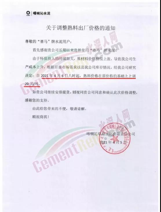 4月12日喀喇沁草原水泥有限責任公司通知,熟料價格在原基礎上上調(diào)10元/噸。據(jù)了解,企業(yè)曾于4月6日上調(diào)熟料價格20元/噸。