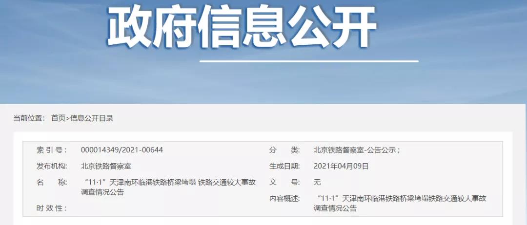 2021年4月9日,國家鐵路局發(fā)布“11·1”天津南環(huán)臨港鐵路橋梁垮塌鐵路交通較大事故調查情況公告。