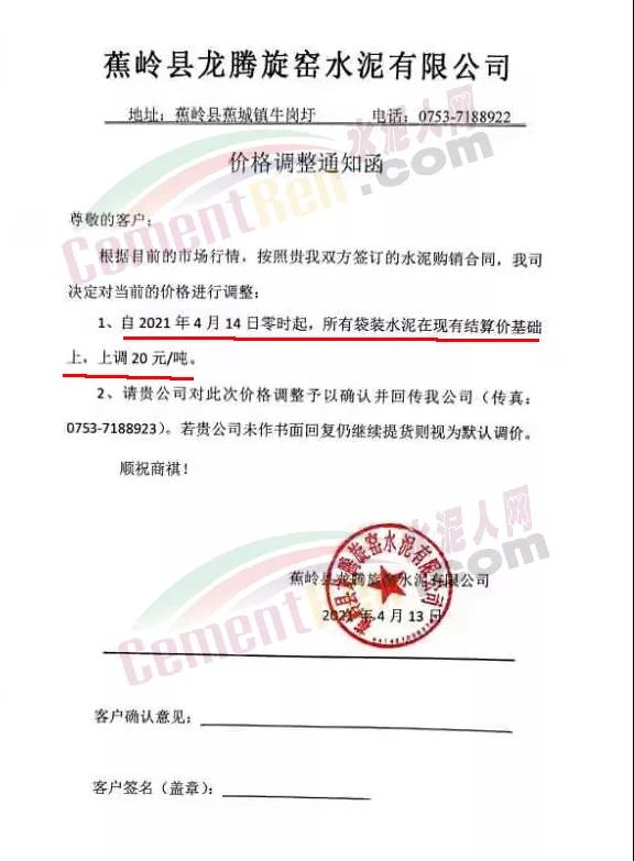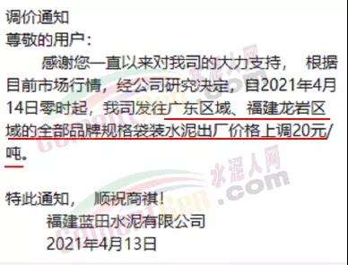 福建藍(lán)田水泥通知從4月14日零時起,發(fā)往廣東區(qū)域、福建龍巖區(qū)域的全部品牌規(guī)格袋裝水泥出廠價格上調(diào)20元/噸。