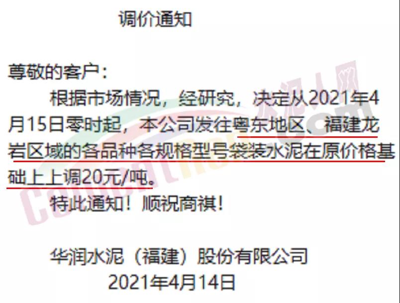 華潤水泥(福建)股份有限公司通知自4月15日零時起,公司發(fā)往粵東地區(qū)、福建龍巖區(qū)域的各品種各規(guī)格型號袋裝水泥在原價基礎(chǔ)上上調(diào)20元/噸。