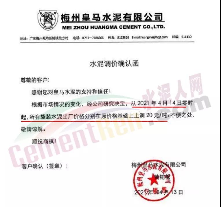 梅州皇馬水泥有限公司通知,自4月14日零時起,所有袋裝水泥出廠價格分別在原價基礎(chǔ)上上調(diào)20元/噸。