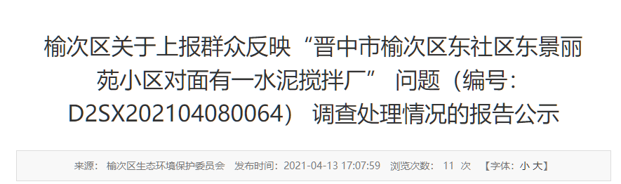 2021年4月8日,收到群眾反映的(編號:D2SX202104080064)環境問題,榆次區高度重視,立即安排晉中市生態環境局榆次分局進行調查。經查,反映情況屬實,現將有關情況報告如下: