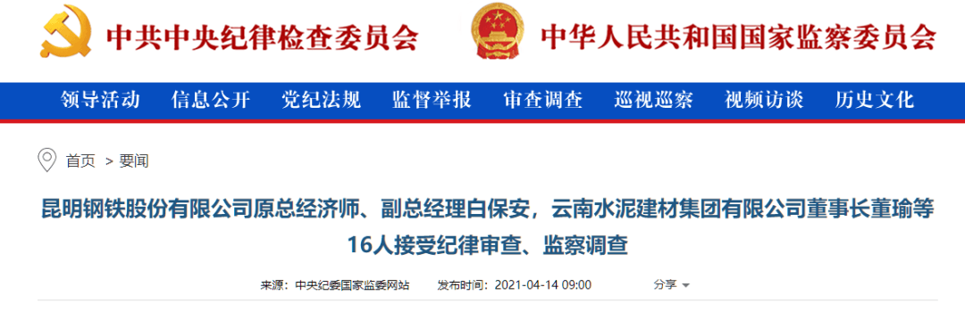 4月14日中央紀委國家監委網站發布要聞消息:昆鋼黨委書記、董事長、云南水泥建材集團有限公司董事長董瑜等多人接受審查調查。詳情如下: