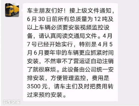根據(jù)規(guī)定,為重卡加裝視頻監(jiān)控是免費的,但是,陸續(xù)有卡友反饋,車隊喊他們?nèi)パb視頻監(jiān)控,需要卡友們自己付費,金額在3000元左右,不裝的話,以后車輛年審就過不了。這里就出現(xiàn)了一個問題,到底是誰在收費?