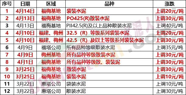 華南區域梅州市塔牌營銷有限公司分別于3月22日、25日以及4月1日、9日、10日、13日、14日連發6份漲價通知,其中梅州基地散裝水泥累計上調達120元/噸以上,福梅基地袋裝水泥累計上調80-90元/噸。
