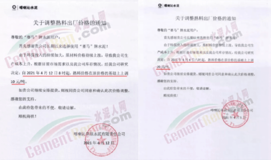 七日之內兩次上調熟料價格,累計漲價30元/噸。企業調價函提到,由于環保投入的持續加大,原材料價格持續上漲,導致公司生產成本上升。