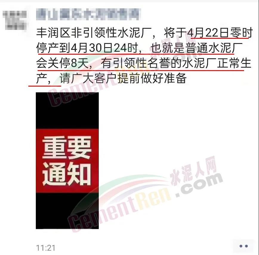 水泥人網通訊員消息:日前,河北唐山豐潤區水泥經銷商通知,“豐潤區非引領性水泥廠,將于4月22日零時停產到4月30日24時,也就是普通水泥廠會關停8天,有引領性名譽的水泥廠正常生產”。同時,區域內部分企業已經率先通知上調水泥價格。