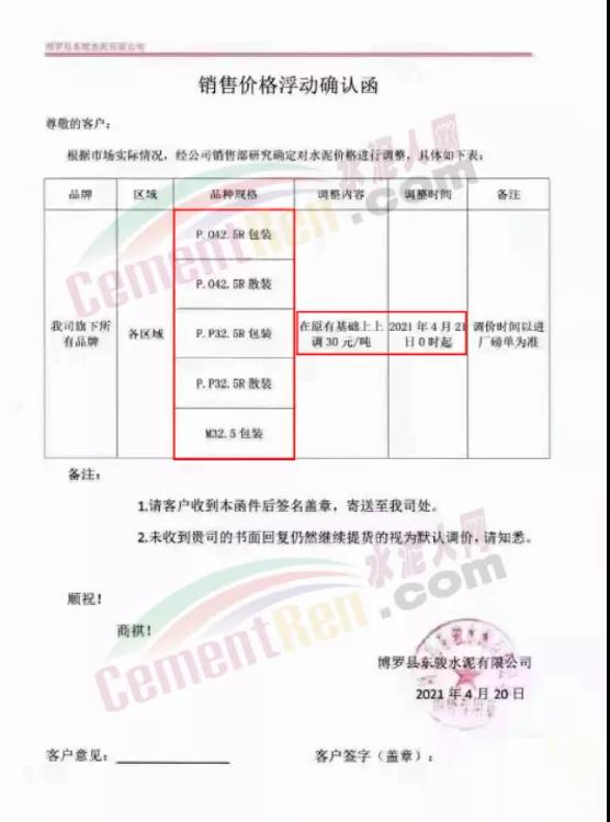 博羅縣東駿水泥有限公司通知自4月21日0時起上調旗下所有品牌各標號水泥價格30元/噸。