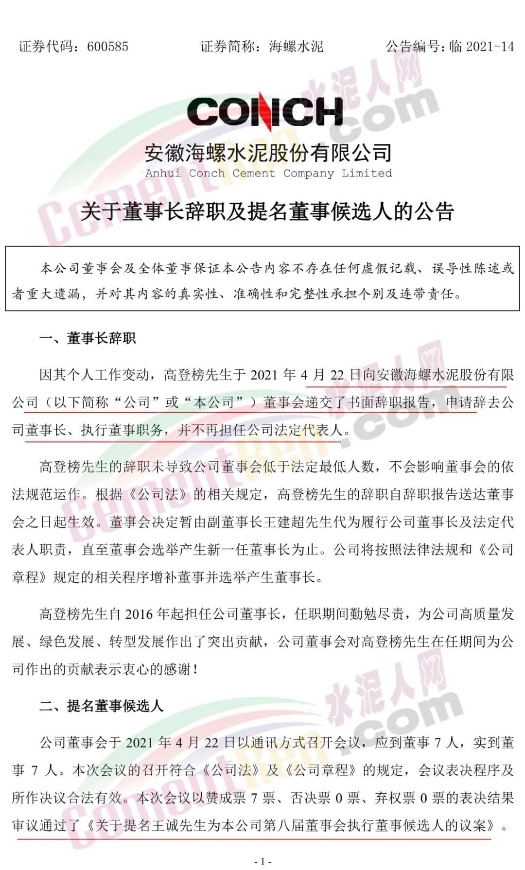 日前,海螺水泥上市公司發布《 關于董事長辭職及提名董事候選人的公告 》稱,因其個人工作變動,高登榜先生于 2021 年 4 月 22 日向安徽海螺水泥股份有限公司董事會遞交了書面辭職報告,申請辭去公司董事長、執行董事職務,并不再擔任公司法定代表人。