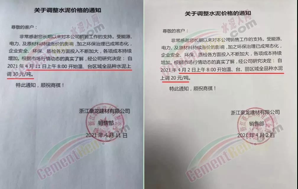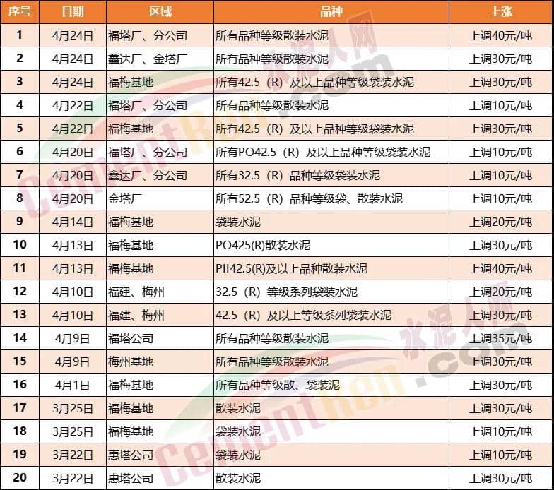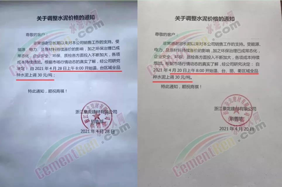 4月20日上午8∶00開始溫、臺、麗、衢區域全品種水泥上調30元/噸。