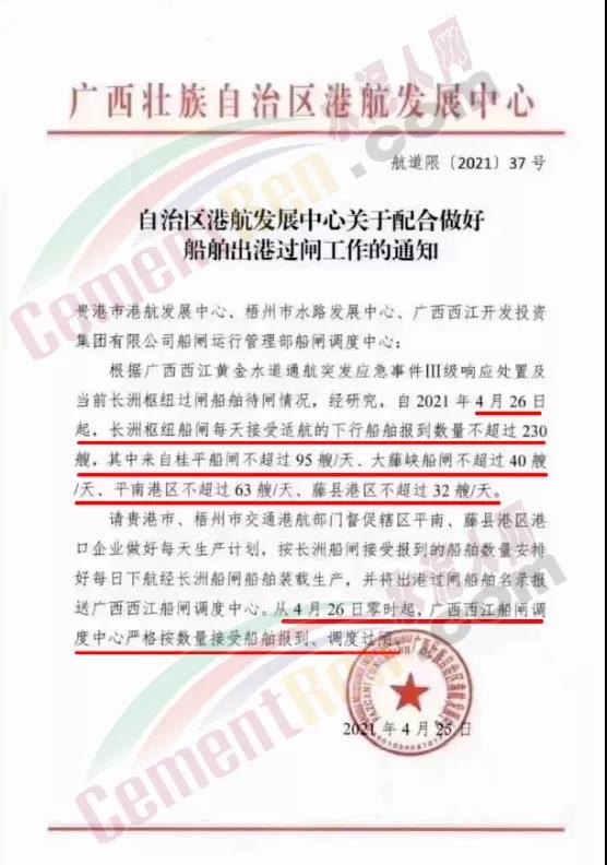 也正因如此,航道對于外來水泥的起到了至關重要的作用,近期廣西港航中心通知要求自4月26日起,長洲樞紐船閘每天接受適航的下行船舶報到數量不超過230艘、其中來自桂平船閘不超過95艘/天、大藤峽船閘不超過40艘/天、平南港區不超過63艘/天、藤縣港區不超過32艘/天。