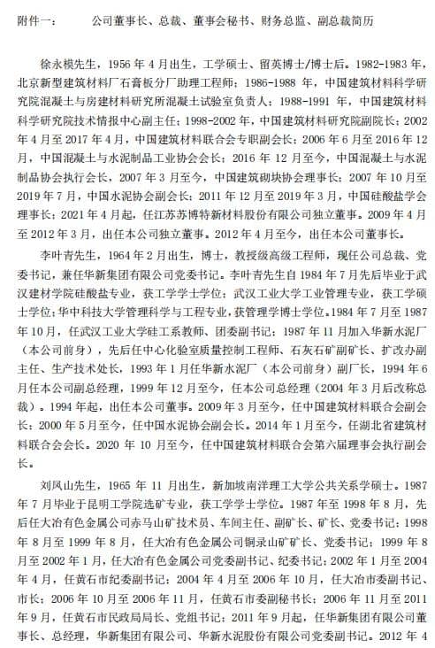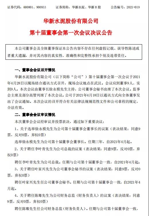 日前,華新水泥股份有限公司發(fā)布第十屆董事會(huì)第一次會(huì)議決議公告。稱,選舉徐永模先生為公司第十屆董事會(huì)董事長(zhǎng)。任期三年,自2021年4月起。