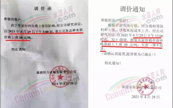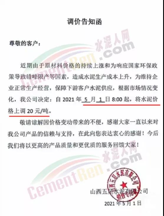 山西五星水泥有限公司發通知稱,近期由于原材料價格的持續上漲和為響應國家環保政策導致錯峰限產等因素,造成水泥生產成本上升,為維持企業正常生產經營,保障下游客戶水泥供應,根據市場情況變化,公司決定自2021年5月1日8時起,將水泥價格上調20元/噸。