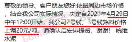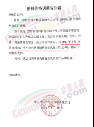遼寧山水旗下喀左叢元號水泥有限責任公司發熟料價格調整告知函稱,鑒于目前原燃材料價格持續上漲、環保成本增加等,造成公司生產成本大幅上漲。經研究決定自2021年4月28日8時起,喀左公司熟料銷售價格執行350 元/噸。