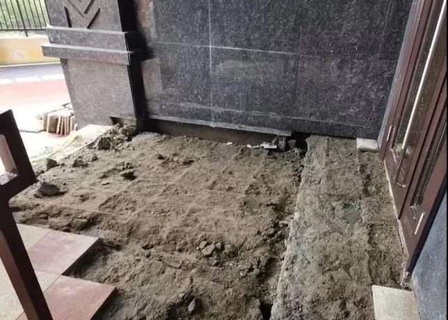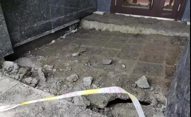 業主說,4月15日開發商通知收房,他24日去小區辦手續,上午9點通過單元樓門庭時,地面還好著,非常平整;但是當他11點多從里面出來時,發現門庭塌陷了。