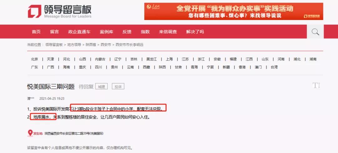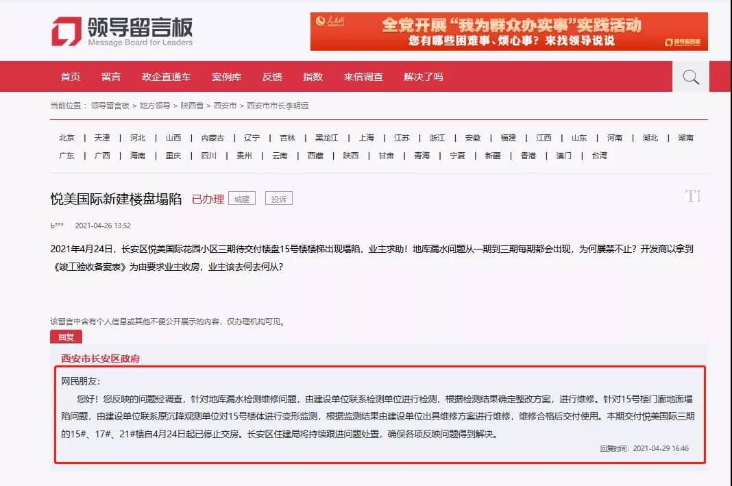 4月29日下午,西安市長安區政府在領導留言板上作出答復,內容為“網民朋友:您好!您反映的問題經調查,針對地庫漏水檢測維修問題,由建設單位聯系檢測單位進行檢測,根據檢測結果確定整改方案,進行維修。針對15號樓門廊地面塌陷問題,由建設單位聯系原沉降觀測單位對15號樓體進行變形監測,根據監測結果由建設單位出具維修方案進行維修,維修合格后交付使用。本期交付悅美國際三期的15#、17#、21#樓自4月24日起已停止交房。長安區住建局將持續跟進問題處置,確保各項反映問題得到解決。”