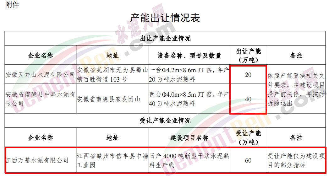 據(jù)水泥人網了解,2019年1月30日安徽省工信廳曾發(fā)布安徽天井山水泥有限公司和安徽省南陵縣中奔水泥有限公司水泥熟料生產線產能出讓的公告。產能出讓情況表顯示,安徽天井山水泥一條水泥熟料生產線和安徽南陵縣中奔水泥兩條水泥熟料生產線產能退出產能為三臺JT窯年產能合計60萬噸。用于江西萬基水泥有限公司建設一條4000t/d水泥熟料生產線。