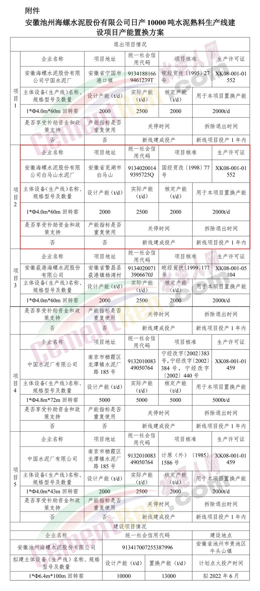2020年7月,安徽省工信廳發(fā)布的一則產能置換方案中提到海螺水泥將通過退出包括安徽省蕪湖市的海螺水泥白馬山水泥廠2000t/d熟料生產線在內的5個項目,用于在池州市境內新建一條10000t/d熟料生產線。退出項目將在新線建成投產前關停,并于新線項目投產1年內拆除。