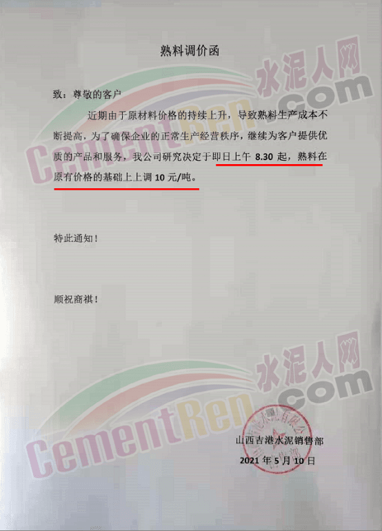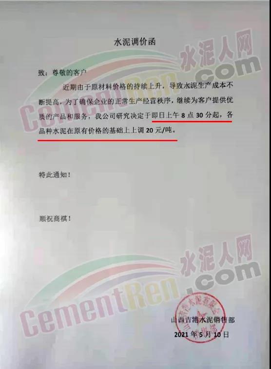 水泥人網通訊員消息,近幾日華北地區多家企業通知上調水泥價格,5月10日山西吉港水泥連發兩份調價函通知水泥漲20元/噸,熟料漲10元/噸。