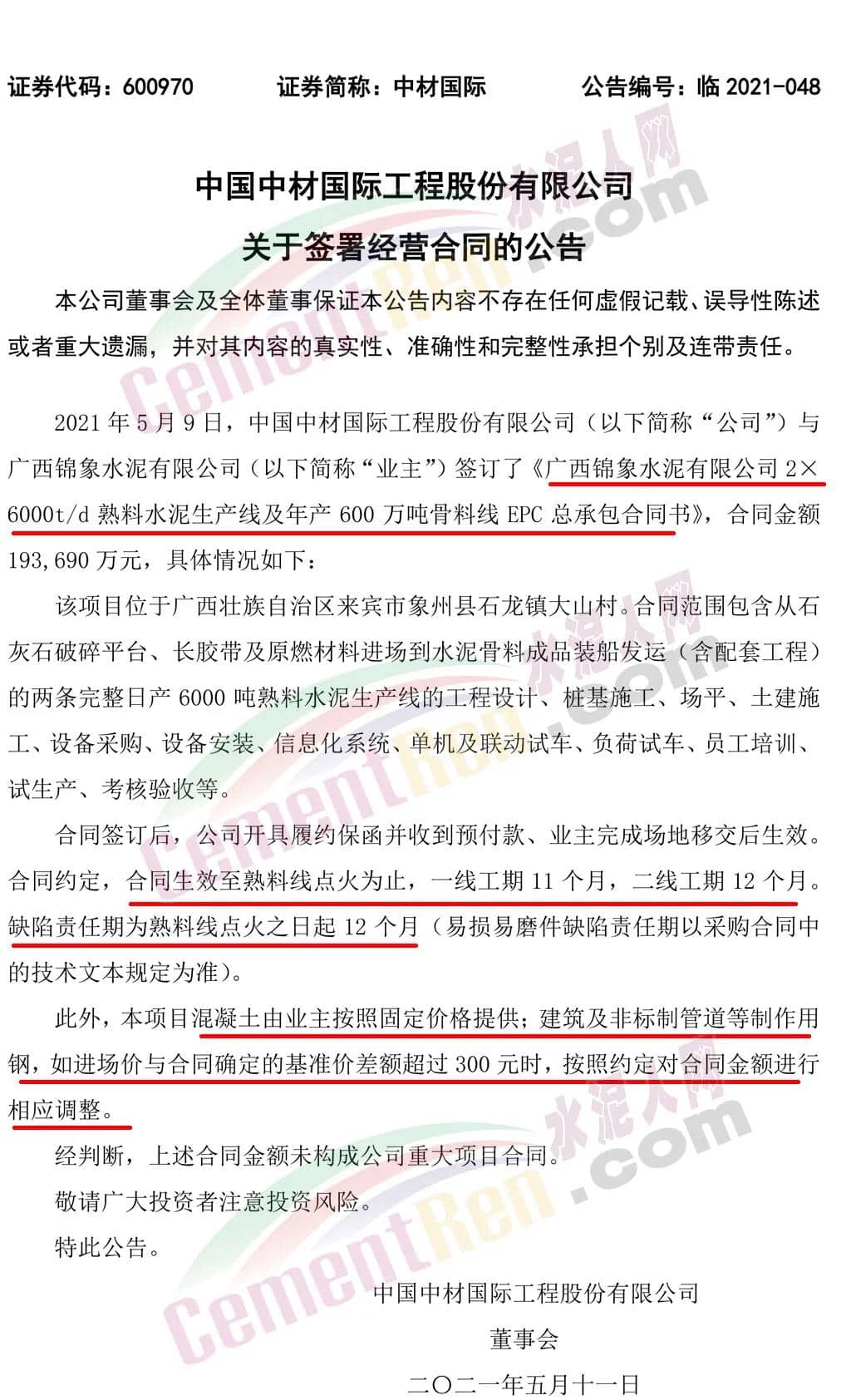 中材國際5月10日晚間公告稱,2021年5月9日,中國中材國際工程股份有限公司與廣西錦象水泥有限公司簽訂了《廣西錦象水泥有限公司2×6000t/d熟料水泥生產(chǎn)線及年產(chǎn)600萬噸骨料線EPC總承包合同書》,合同金額193,690萬元。