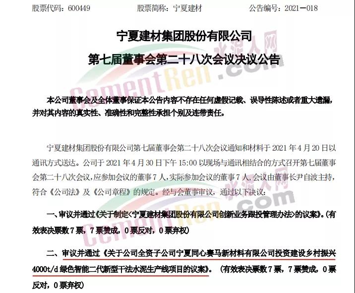 寧夏建材近日公布公司第七屆董事會第二十八次會議決議,審議并通過關于公司全資子公司寧夏同心賽馬新材料有限公司投資建設鄉村振興4000t/d綠色智能二代新型干法水泥生產線項目的議案。