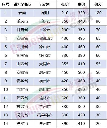 重點(diǎn)監(jiān)控省市自治區(qū)PO42.5散裝水泥價(jià)差一覽