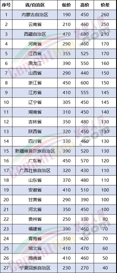 從各個(gè)省自治區(qū)不同企業(yè)報(bào)價(jià)差距來看,價(jià)差從40~260元/噸不等,其中內(nèi)蒙、西藏、云南、河南、江西、黑龍江、山西、浙江、江蘇等21個(gè)省、自治區(qū)價(jià)差均在100元/噸以上。
