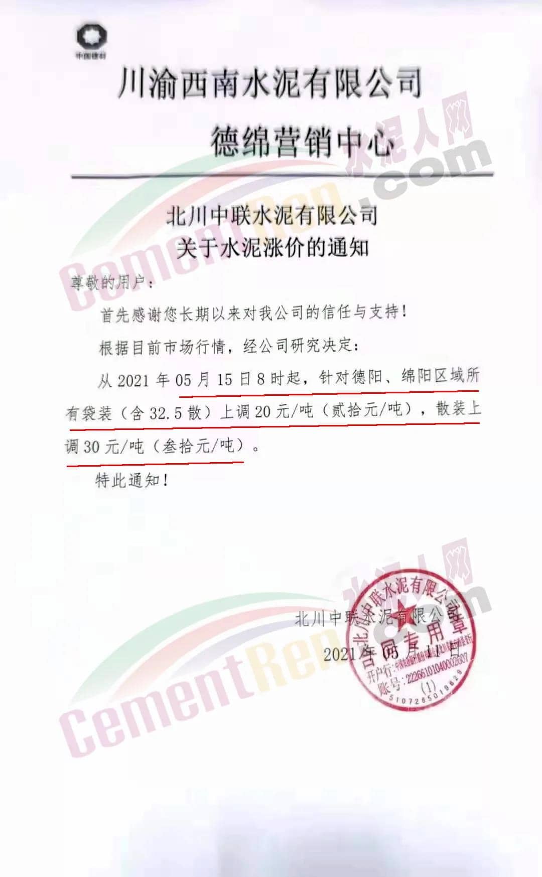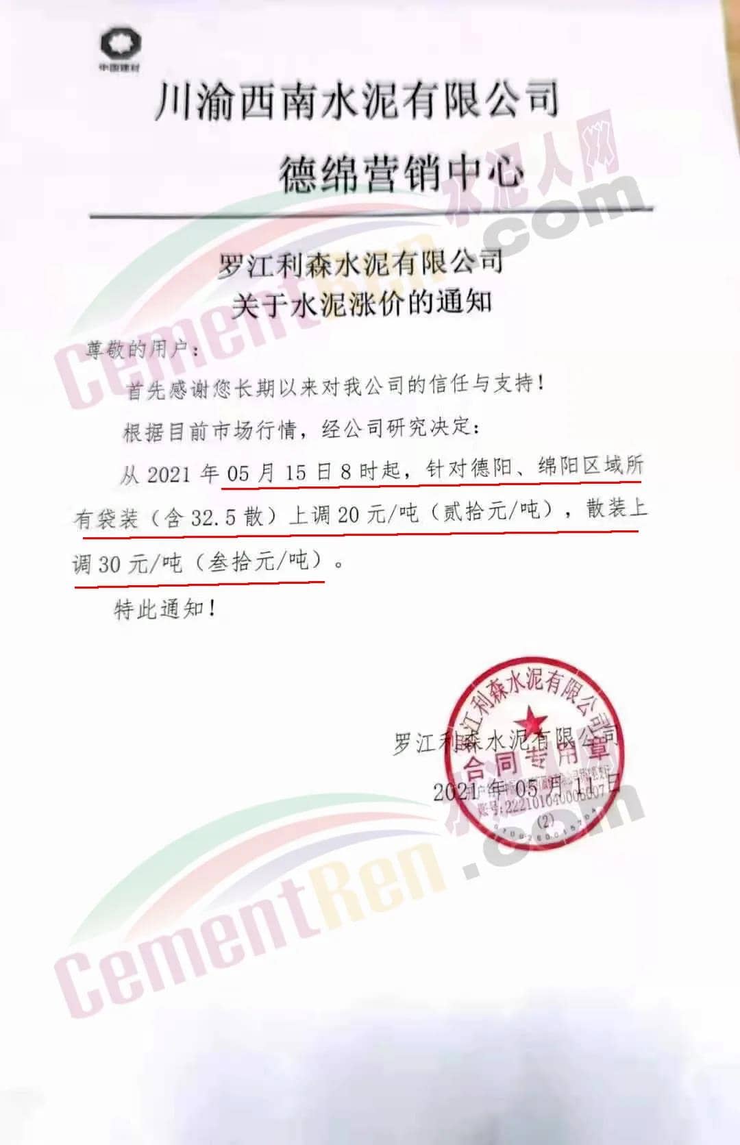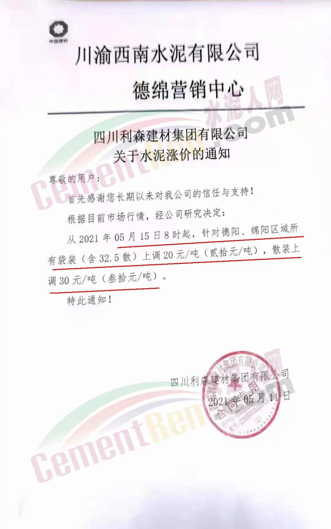 水泥人網通訊員消息 ,5月11日川渝西南水泥有限公司德綿營銷中心①羅江利森水泥有限公司、②四川省女媧建材有限公司、③四川省棉竹澳東水泥有限責任公司、④四川利森建材集團有限公司、⑤四川國大水泥有限公司、⑥北川中聯水泥有限公司等六家企業集體發調價通知稱,根據目前市場行情,經公司研究決定∶從 2021 年 5 月15 日 8 時起,針對德陽、綿陽區域所有袋裝(含 32.5散)上調 20元/噸(貳拾元/噸),散裝上調 30 元/噸(叁拾元/噸)。