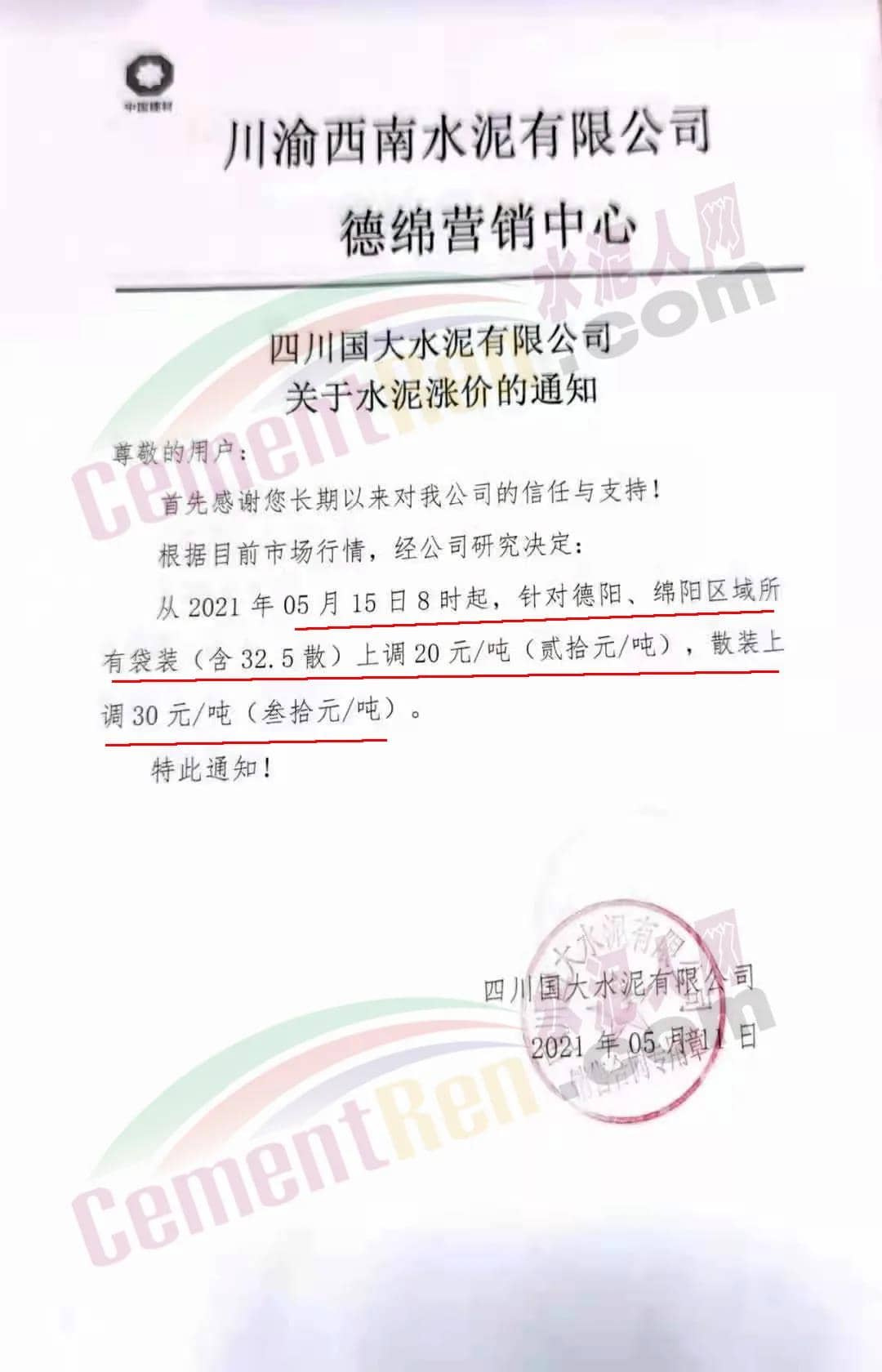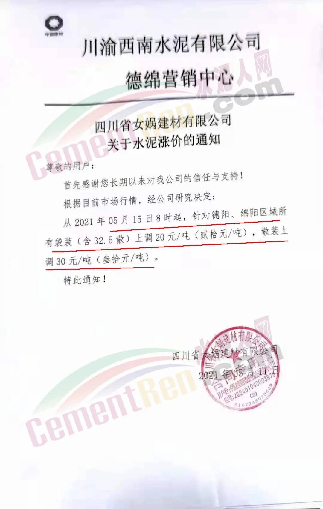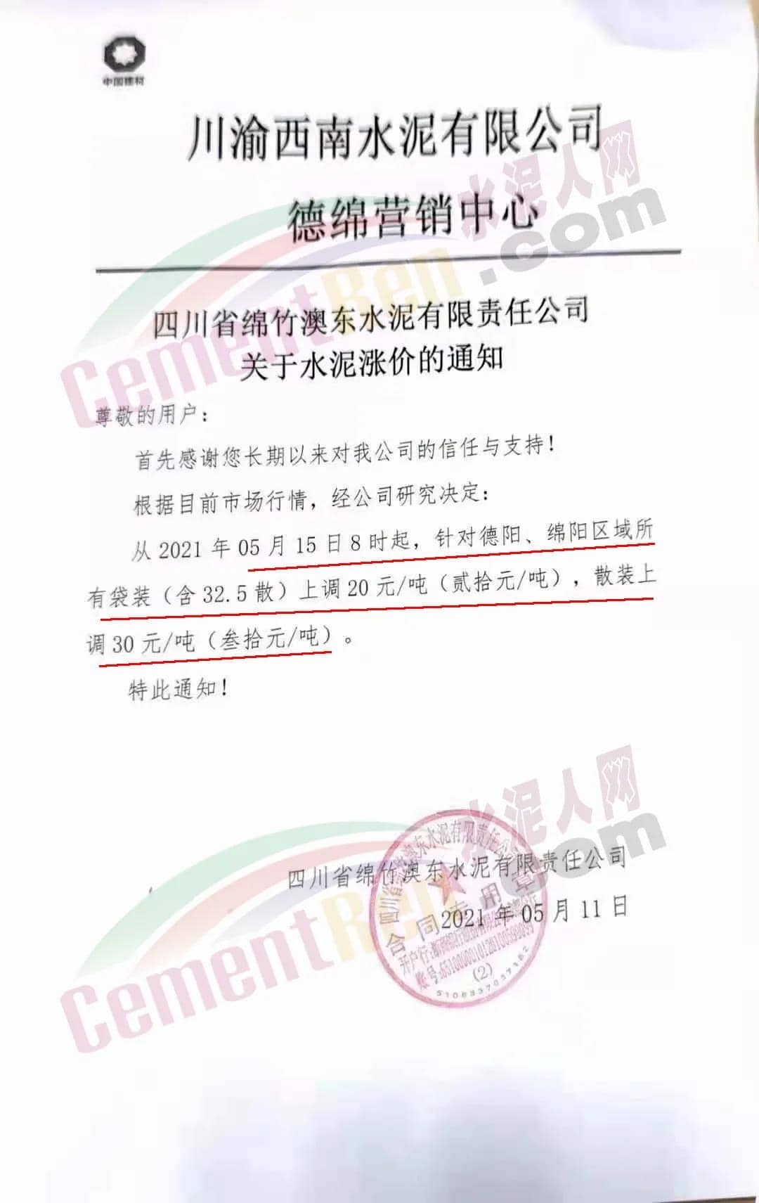 水泥人網通訊員消息 ,5月11日川渝西南水泥有限公司德綿營銷中心①羅江利森水泥有限公司、②四川省女媧建材有限公司、③四川省棉竹澳東水泥有限責任公司、④四川利森建材集團有限公司、⑤四川國大水泥有限公司、⑥北川中聯水泥有限公司等六家企業集體發調價通知稱,根據目前市場行情,經公司研究決定∶從 2021 年 5 月15 日 8 時起,針對德陽、綿陽區域所有袋裝(含 32.5散)上調 20元/噸(貳拾元/噸),散裝上調 30 元/噸(叁拾元/噸)。