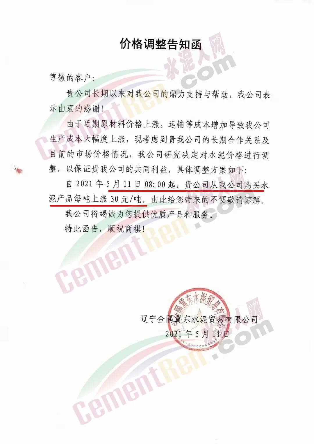 同日,東北區域的遼寧金隅冀東水泥貿易有限公司的通知稱,由于近期原材料價格上漲,運輸等成本增加導致我公司生產成本大幅度上漲,自 2021年5月11日08∶00起,貴公司從我公司購買水泥產品每噸上漲 30元/噸。